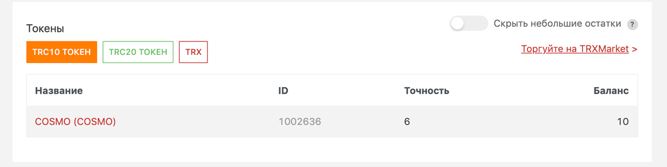 Все токены блокчейна Tron разделены на: TRC10, TRC20 и TRX. Каждый аккаунт имеет право на бесплатную раздачу 10 токенов COSMO.