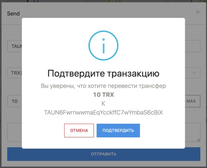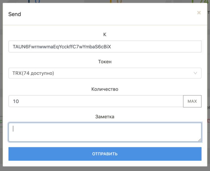 - Затем откроется диалоговое окно, где нам необходимо ввести адрес криптокошелька TRX либо токена TRC-20.