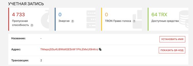Затем откроется страница, где будет отображаться наша учетная запись, основные параметры блокчейна, наш кошелек TRX и его баланс.