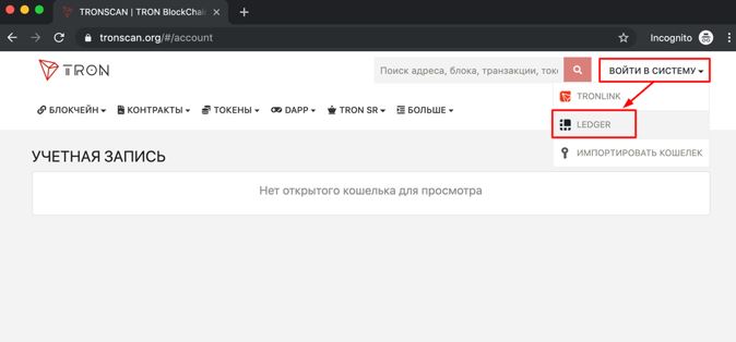 - Наведите курсор на ВОЙТИ, затем нажмите на LEDGER.