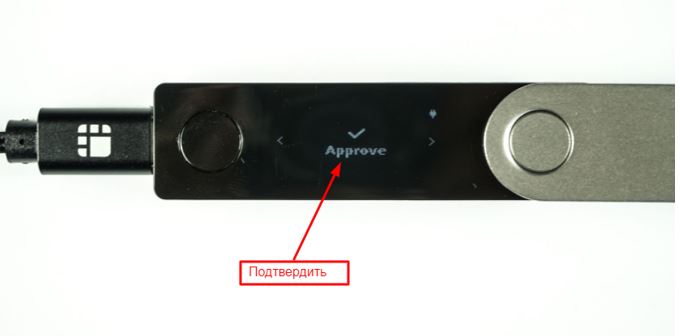- Дальше смотрим на аппаратный кошелек Ledger и подтверждаем в нем операцию.