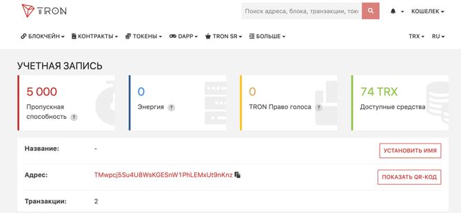 Затем откроется страница, где будет отображаться наша учетная запись, основные параметры блокчейна, наш кошелек TRX и его баланс.
