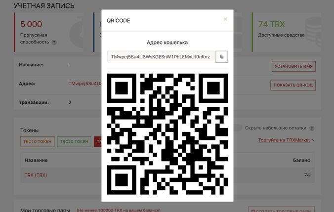 Для получения средств (TRX) понадобиться скопировать адрес нашего криптокошелька. По-другому сделать это можно через qr-код учетной записи.