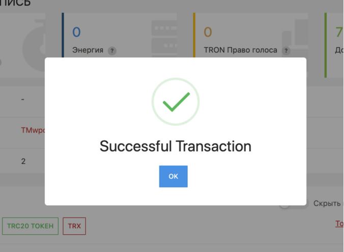 В качестве проверки отправленных средств баланс кошелька TRX должен уменьшится на 10 монет.