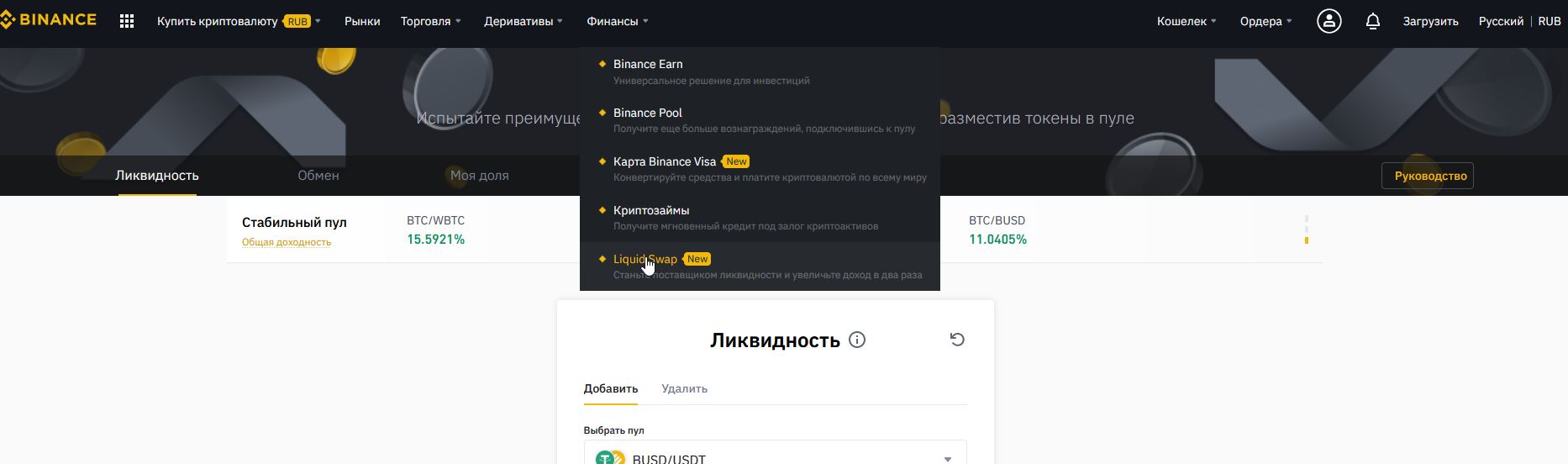 ΠΠ»Ρ ΡΡΠΎΠ³ΠΎ Π·Π°Ρ ΠΎΠ΄ΠΈΠΌ Π½Π° Π±ΠΈΡΠΆΡ BINANCE, Π·Π°Π»ΠΎΠ³ΠΈΠ½ΠΈΠΌΡΡ ΠΈ Π΄Π°Π»ΡΡΠ΅ Π½Π°ΠΆΠΈΠΌΠ°Π΅ΠΌ ΡΠΈΠ½Π°Π½ΡΡ, Π²ΡΠ±ΠΈΡΠ°Π΅ΠΌ liquid swap - ΡΡΠΎΡ ΠΈΠ½ΡΡΡΡΠΌΠ΅Π½Ρ ΠΎΡΠ½ΠΎΠ²Π°Π½ Π½Π° ΠΏΡΠ»Π°Ρ Π»ΠΈΠΊΠ²ΠΈΠ΄Π½ΠΎΡΡΠΈ Π΄Π»Ρ ΠΎΠ±ΠΌΠ΅Π½Π° ΠΊΡΠΈΠΏΡΠΎΠ²Π°Π»ΡΡΠ°ΠΌΠΈ. ΠΠΎ ΡΠΈΠΏΡ ΡΠ½ΠΈΡΠΎΠ², Π±Π°Π»Π°Π½ΡΠ΅Ρ ΠΈ ΠΏΡΠΎΡΠΈΡ .