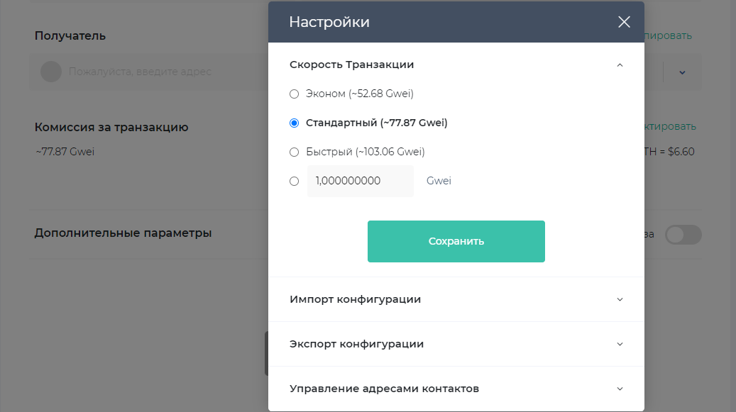 - Π‘ΠΌΠΎΡΡΠ΅ΡΡ Π² ΠΊΠΎΡΠ΅Π»ΡΠΊΠ΅. ΠΡΠΈ ΠΎΡΠΏΡΠ°Π²ΠΊΠ΅ ΠΈΠ· ΠΏΠΎΠΏΡΠ»ΡΡΠ½ΠΎΠ³ΠΎ myetherwallet Π² Π΄Π΅ΡΠ°Π»ΡΡ ΡΡΠ°Π½Π·Π°ΠΊΡΠΈΠΈ Π΅ΡΡΡ Π²ΠΎΠ·ΠΌΠΎΠΆΠ½ΠΎΡΡΡ Π²ΡΠ±ΡΠ°ΡΡ ΠΎΠ΄ΠΈΠ½ ΠΈΠ· Π°ΠΊΡΡΠ°Π»ΡΠ½ΡΡ Π²Π°ΡΠΈΠ°Π½ΡΠΎΠ² ΡΡΠΎΠΈΠΌΠΎΡΡΡ Π² Π΄Π°Π½Π½ΡΠΉ ΠΌΠΎΠΌΠ΅Π½Ρ Π²ΡΠ΅ΠΌΠ΅Π½ΠΈ, Π° ΡΠ°ΠΊΠΆΠ΅ ΠΏΡΠΈ Π½Π΅ΠΎΠ±Ρ ΠΎΠ΄ΠΈΠΌΠΎΡΡΠΈ ΡΡΡΠ°Π½ΠΎΠ²ΠΈΡΡ ΡΠ²ΠΎΡ Π·Π½Π°ΡΠ΅Π½ΠΈΠ΅.