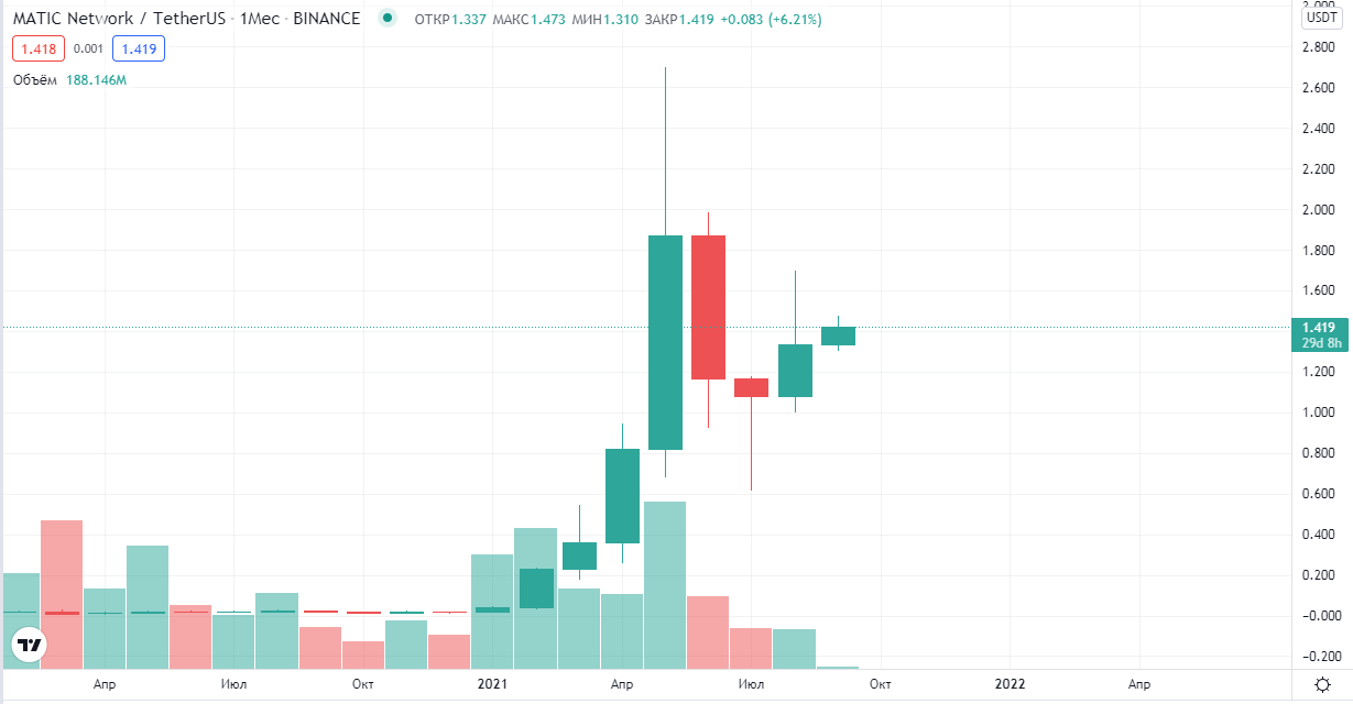 Π¦Π΅Π½Π° Matic ΡΠΎΡΡΠ°Π²Π»ΡΠ»Π° Π²ΡΠ΅Π³ΠΎ $ 0,19 Π² ΡΠ½Π²Π°ΡΠ΅ 2021 Π³ΠΎΠ΄Π°, Π² ΠΏΠΎΡΠ»Π΅Π΄ΡΡΡΠΈΠ΅ ΠΌΠ΅ΡΡΡΡ ΠΎΠ½ ΠΏΠΎΠ΄Π½ΡΠ»ΡΡ Π΄ΠΎ ΡΠ΅ΠΊΠΎΡΠ΄Π½ΡΡ $ 2,63, ΠΏΡΠ΅ΠΆΠ΄Π΅ ΡΠ΅ΠΌ ΡΠΏΠ°ΡΡΡ Π΄ΠΎ ΠΎΡΠΌΠ΅ΡΠΊΠΈ Π² $ 1,44.